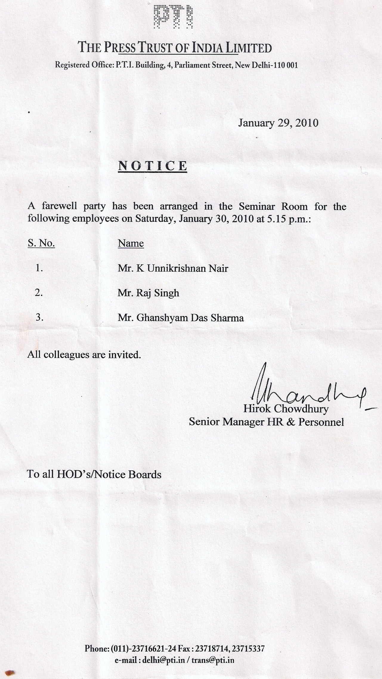 In fact, this PTI NOTICE (seen in the left) justifies my crusade. Actually, on January 30, 2010, four members of PTI staff retired from its Delhi office, situated at 4 Parliament Street. Kashmir Singh was one of them. But, a cold-blooded nasty management ensured that Kashmir is hurt to the hilt. Kashmir was crying while showing me this NOTICE, copies of which were pasted throughout PTI office. You can see in this NOTICE that while PTI announced a farewell party for the other three employees, it deliberately humiliated Kashmir by blatantly insulting him and not organizing his farewell. Will it not be a good idea to send letters to PTI CEO M.K.Razdan asking him if he is racist? What an insult he arranged for Kashmir! Shame on the Senior Manager Hirok Chowdhury also for signing such inhuman NOTICE. Shame! Shame!! Shame!!! (Click on the NOTICE to enlarge it.)