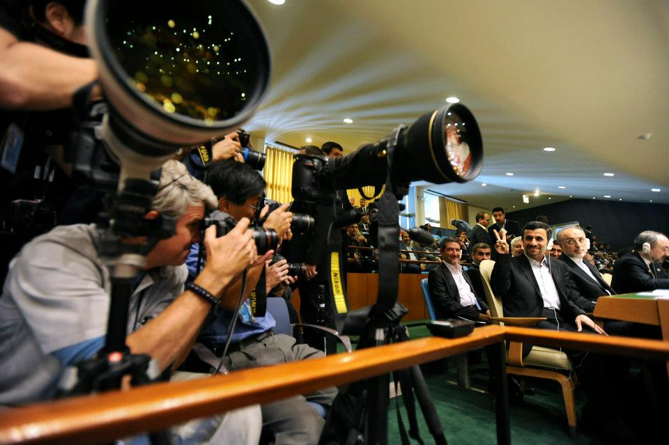 Even in the picture, Ahmadinejad (third from right), can be seen flashing the peace sign from his seat on the floor of the General Assembly Hall, immediately before his statement at the general debate.