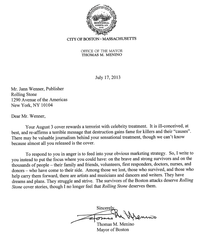 Here’s Boston Mayor Thomas Menino’s strong letter to Rolling Stone: